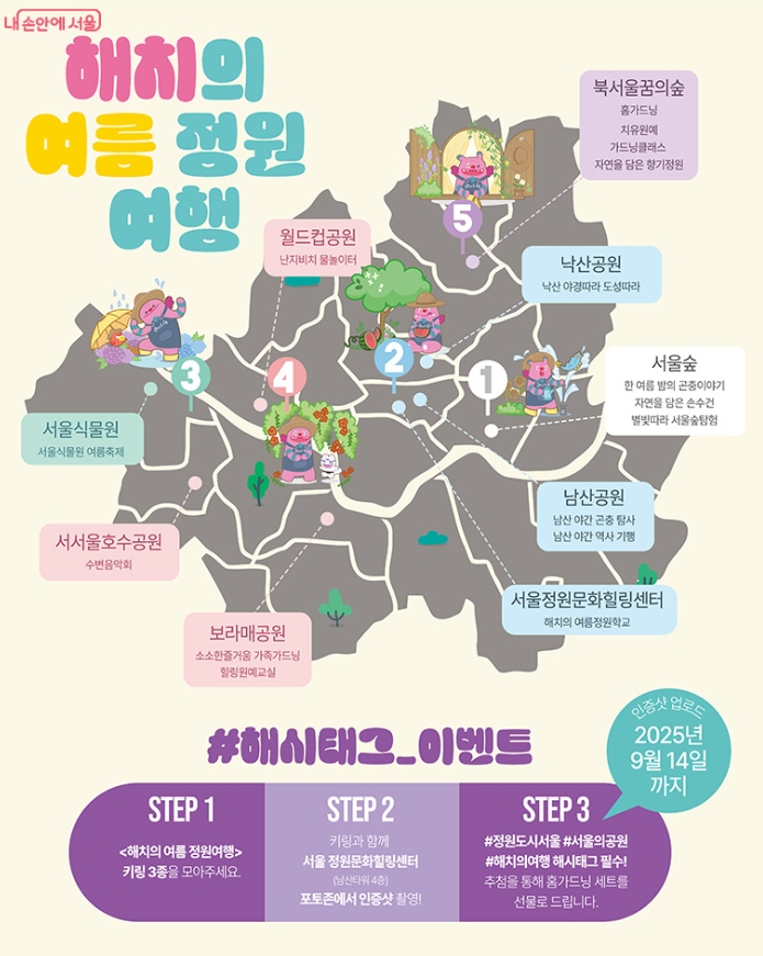 ‘해치의 여름정원 여행’은 서울 정원도시 프로젝트의 일환으로 진행되며, 서울숲, 남산공원, 서울식물원, 월드컵공원, 보라매공원 등 총 9개 장소에서 열립니다. 이 프로그램은 자연을 단순히 보는 것을 넘어서, 만지고, 만들고, 참여하는 경험으로 구성되어 있어 아이들에게는 생태교육이 되고 어른들에게는 힐링이 되는 시간입니다.